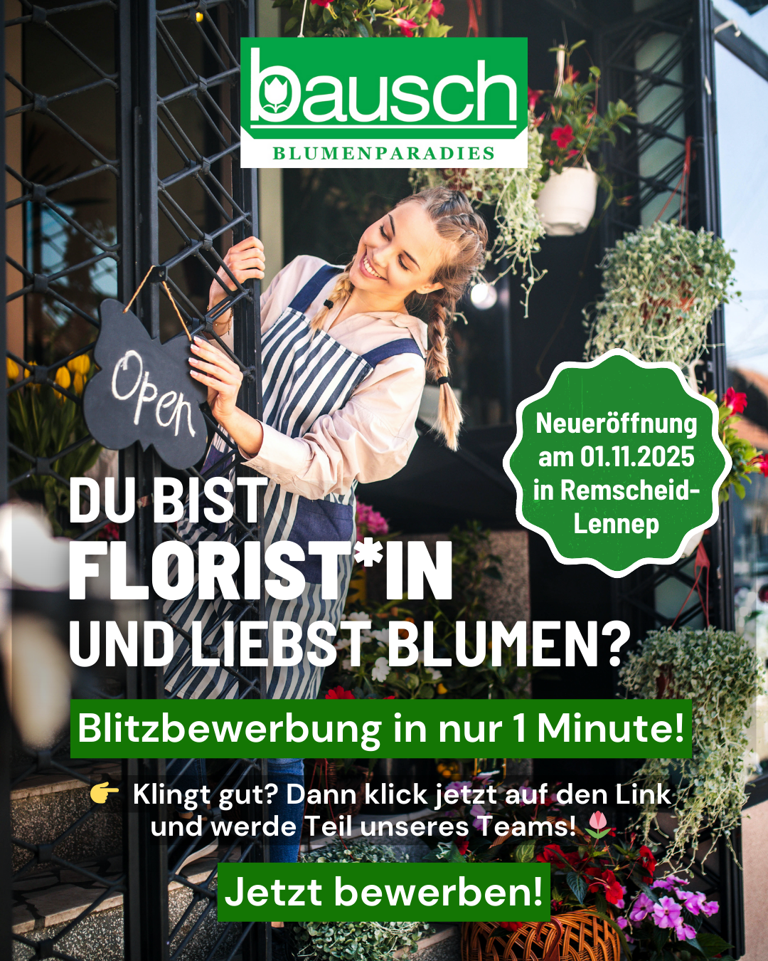 In unserer neuen Filiale in Remscheid-Lennep erwartet dich ein moderner und sicherer Arbeitsplatz mit abwechslungsreichen Aufgaben und viel Raum für deine gestalterischen Ideen. Ob mit abgeschlossener Ausbildung oder Erfahrung im Floristikbereich – wir freuen uns auf engagierte Persönlichkeiten, die mit Leidenschaft und Fachwissen unser Team bereichern.