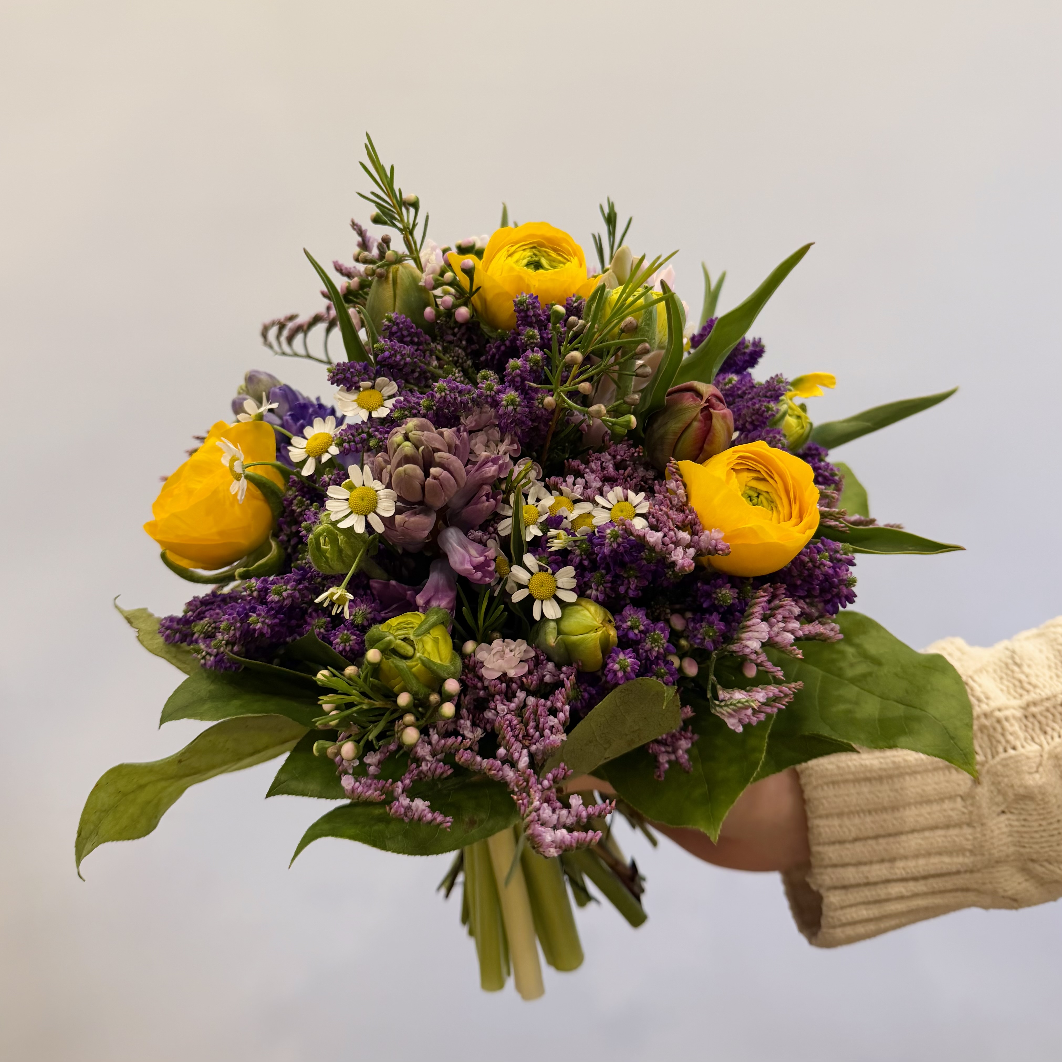 Dieser Strauß enthält beispielsweise: je nach Saison Ranunkeln, Tulpen, Strandflieder, Kamille und frisches Beiwerk. Farben und genaue Zusammenstellung können je nach Saison leicht variieren.